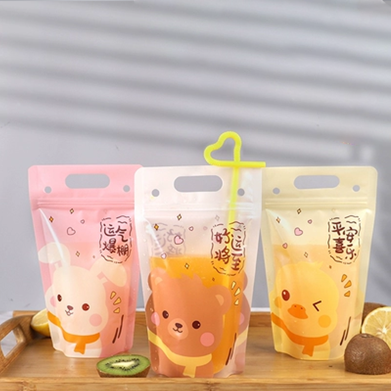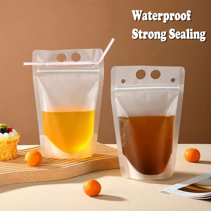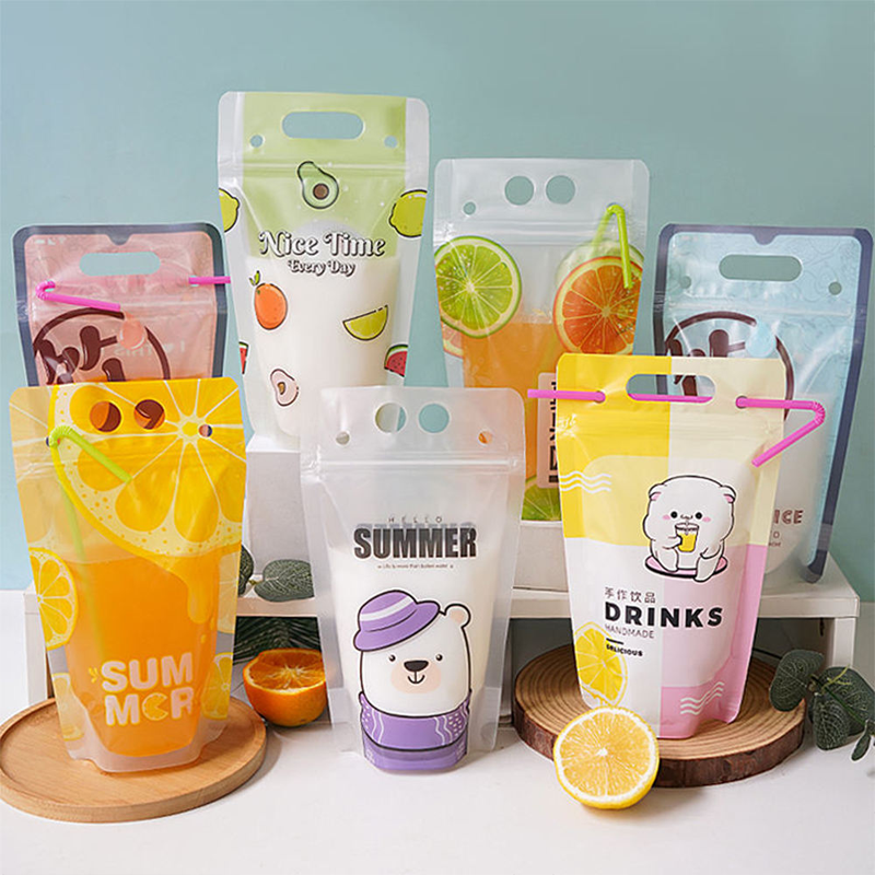 Em comparação com um copo padrão, bolsas transparentes para sucos com canudos oferecem uma área imprimível generosa. Se você usa adesivos para pequenas tiragens ou gráficos de cobertura total para campanhas, a face da bolsa funciona como um mini painel publicitário para logotipos, sabores, códigos QR e hashtags.