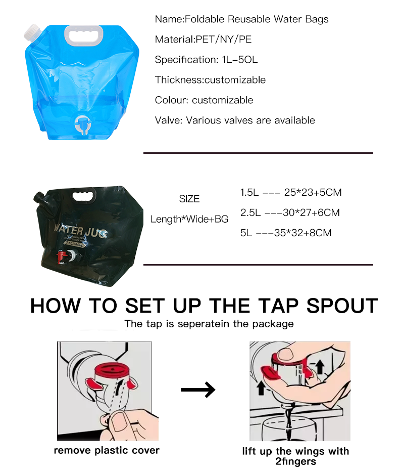 Mula sa camping tuwing katapusan ng linggo at mahabang lakbay, hanggang sa paglalakbay gamit ang RV, mga festival, pagsakay sa bangka, at mga kit para sa emerhensiya, ang mga natatable na supot ng tubig ay nagbibigay ng bihira ngunit kamangha-manghang kombinasyon ng portabilidad, kaligtasan, tibay, at sustenibilidad. Ang naka-standing na supot ay nagpapanatiling agile habang ikaw ay gumagalaw; ang kubong may tapon ay nagbabago ng anumang mesa sa isang mapagkakatiwalaang sentro ng hydration. Mag-pack ng mas magaan, bawasan ang basura, at manatiling hydrated—saan man dadalhin ng landas.